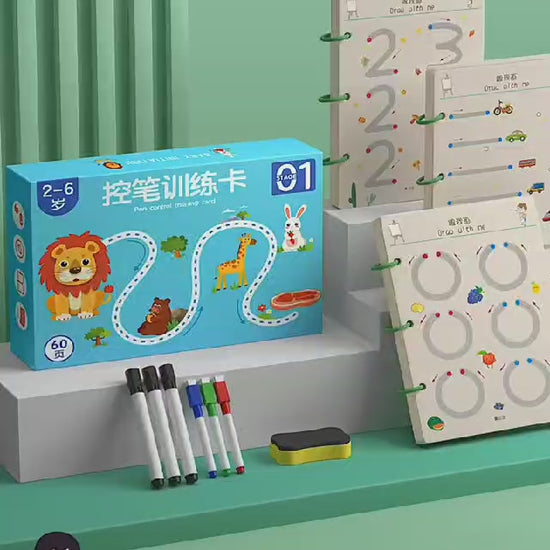 The set comes with 2 markers, a duster, and reusable pages—perfect for building early writing skills, hand-eye coordination, and concentration in a playful way.